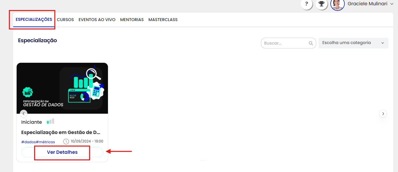 Você visualizará a página das especializações e o evento disponível para inscrição, como mostra a imagem abaixo. Clique em Ver Detalhes: