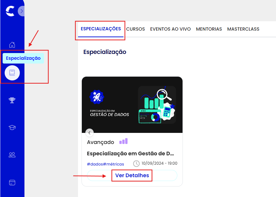 - Ou, busque no menu lateral a opção Especialização, como mostra a imagem abaixo, e clique em Ver Detalhes: