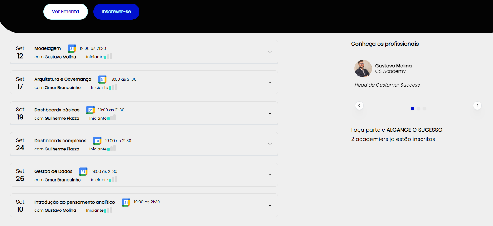 O conteúdo apresentado nas aulas das Especializações é de nível avançado e com foco em gestão de time e área. Por isso, caso você não tenha o pré-requisito, antes de participar das especializações, indicamos que você se prepare com os cursos e masterclasses disponíveis em nossa plataforma de cursos.