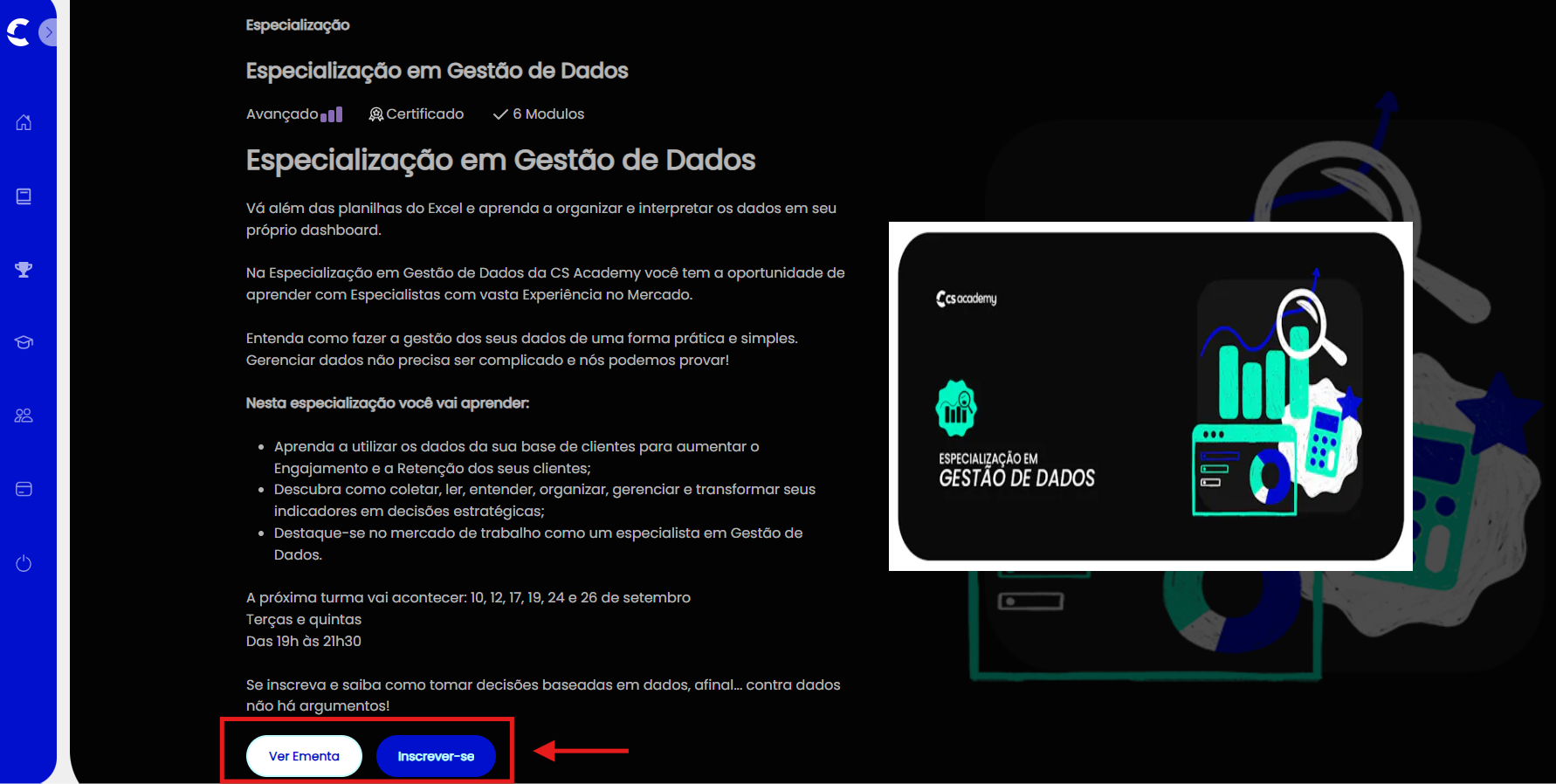 Para se inscrever um uma Especialização, acesse no menu lateral a opção Especialização ou utilize esse link: https://club.csacademy.com.br/user-journey/specialization: