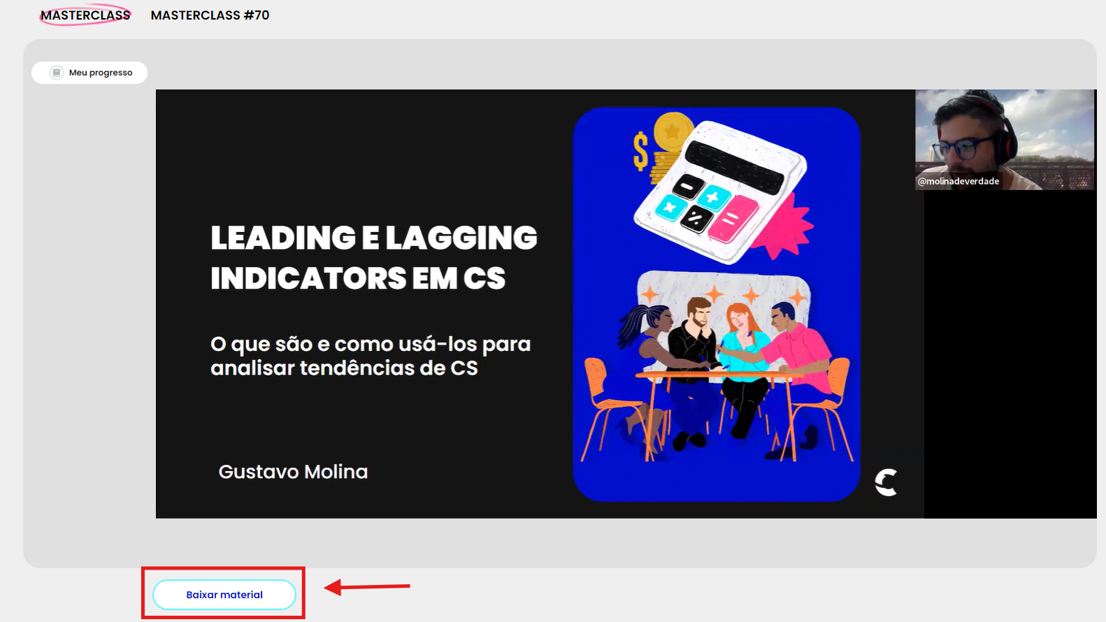 Esse material utilizado ficará disponível logo abaixo do vídeo, em um botão escrito "Baixar material", como mostra a imagem abaixo. Clicando no botão, uma nova aba do navegador será aberta, com o arquivo em pdf, e você poderá realizar o download.