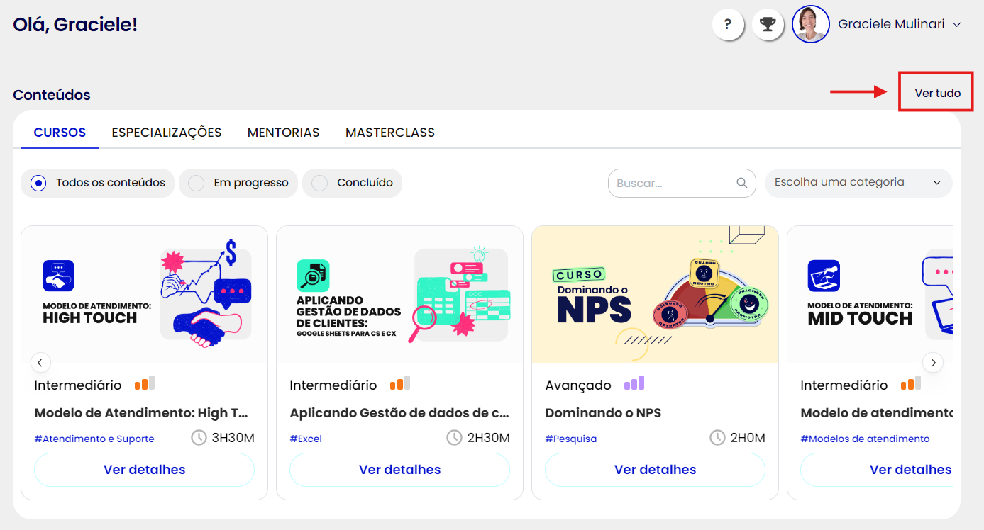 Ao acessar a Home, a seção inicial de Conteúdos apresenta as opções de Cursos, Especializações, Mentorias e Masterclass.