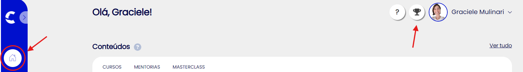 1ª) Acessando a Home na plataforma (símbolo de uma casa no menu lateral), você encontra o botão para visualizar o Ranking (símbolo de um troféu) no canto direito superior, ao lado do seu nome e foto: