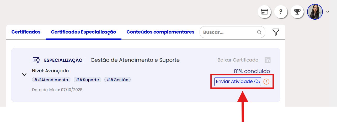 Em seguida, identifique a Especialização que concluiu (ela deve estar no topo da página), clique em “Enviar Atividade”, e selecione o arquivo em formato PDF: