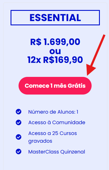 Ao assinar o plano Essential pelo site da CS Academy clicando em “Comece 1 mês Grátis”, você será direcionado para o checkout e, ao confirmar a compra, você garante os primeiros 30 dias de acesso gratuito: