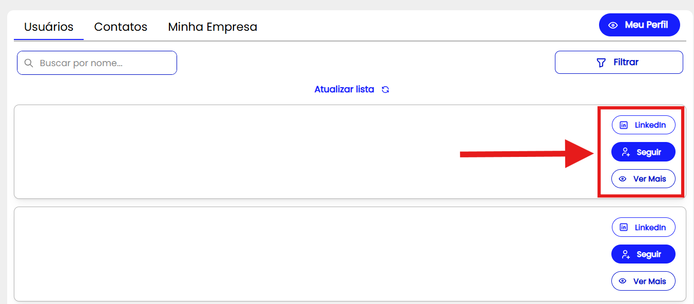 • Seguir: Envia uma solicitação de amizade dentro da plataforma (a conexão ocorre após o aceite).