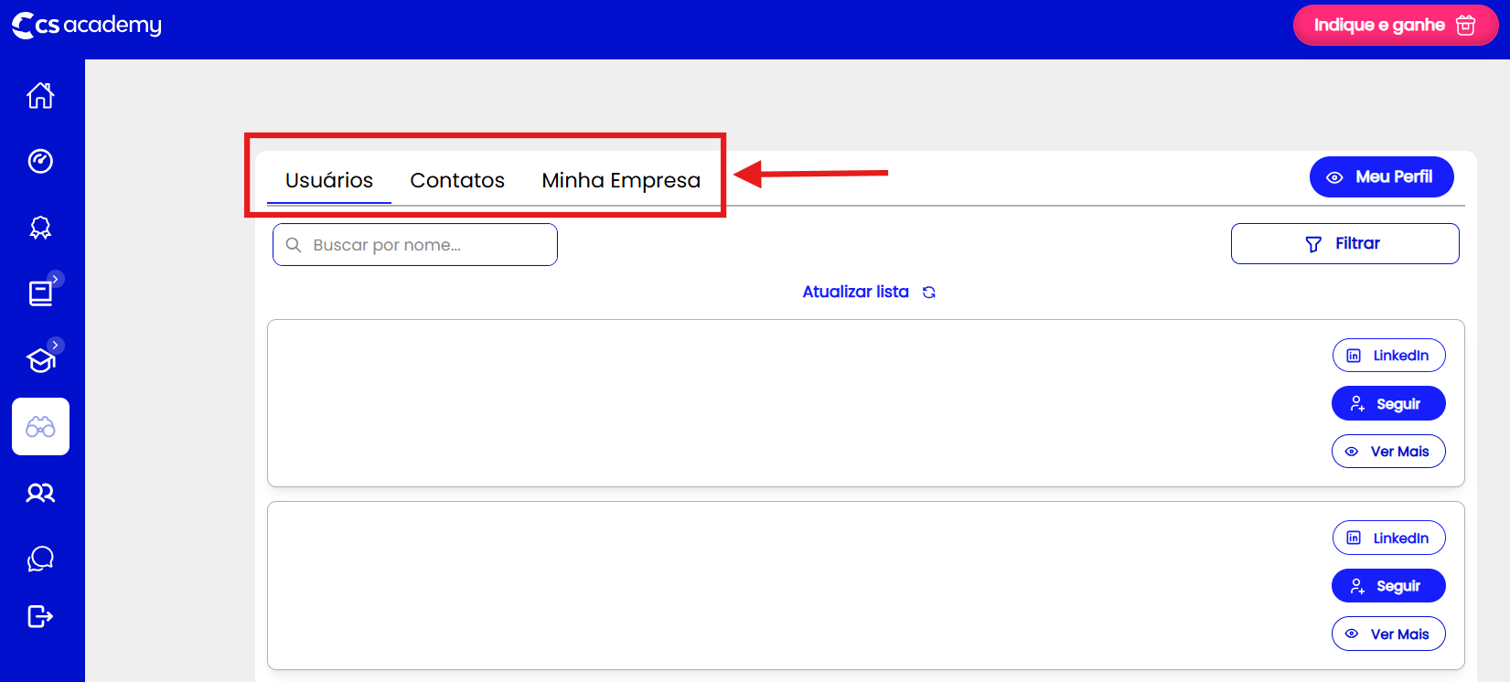• Usuários: Esta é a aba principal para descoberta. Aqui são exibidos todos os alunos da CS Academy e perfis disponíveis para conexão dentro da plataforma (exceto usuários Business).